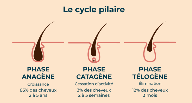 Pour comprendre, il faut revenir au cycle naturel de vie du cheveu, qui se déroule en trois grandes phases :