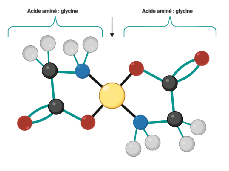 Le bisglycinate, c’est une forme chélatée spécifique, dans laquelle le minéral est lié à deux molécules de glycine, un acide aminé naturellement présent dans le corps humain.