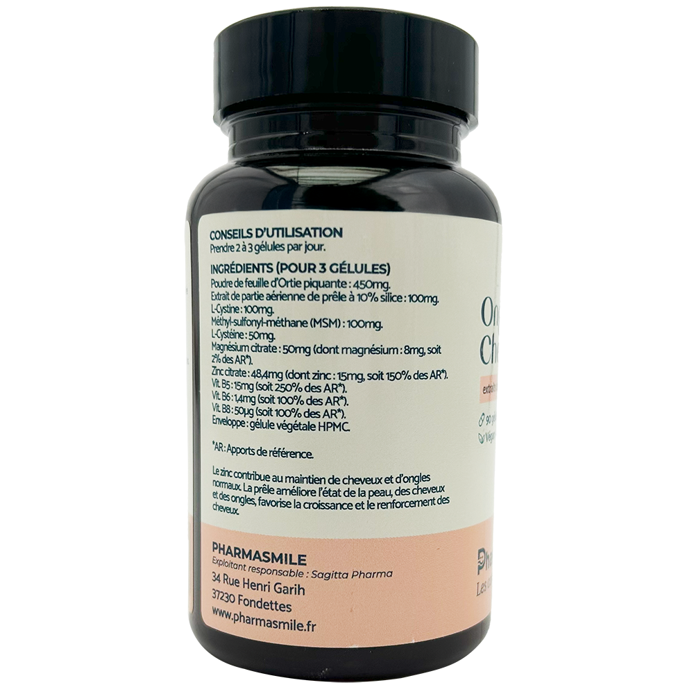 Ongles & Cheveux est un complément alimentaire naturel et vegan, conçu pour accompagner la santé et la force des cheveux, ongles et de la peau. Sa formule associe une synergie d’extraits de plantes, de zinc et de biotine, sélectionnés pour agir en profondeur et favoriser une meilleure croissance ainsi qu’une structure renforcée.